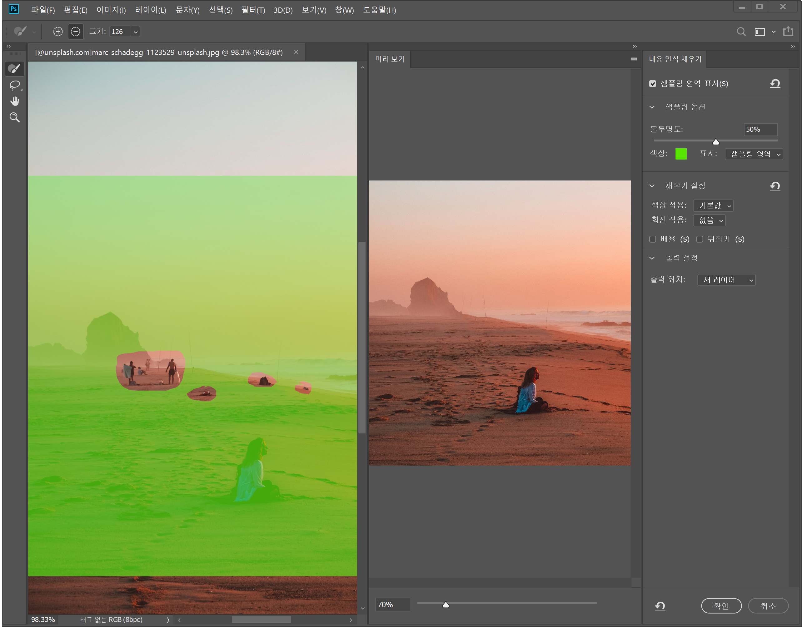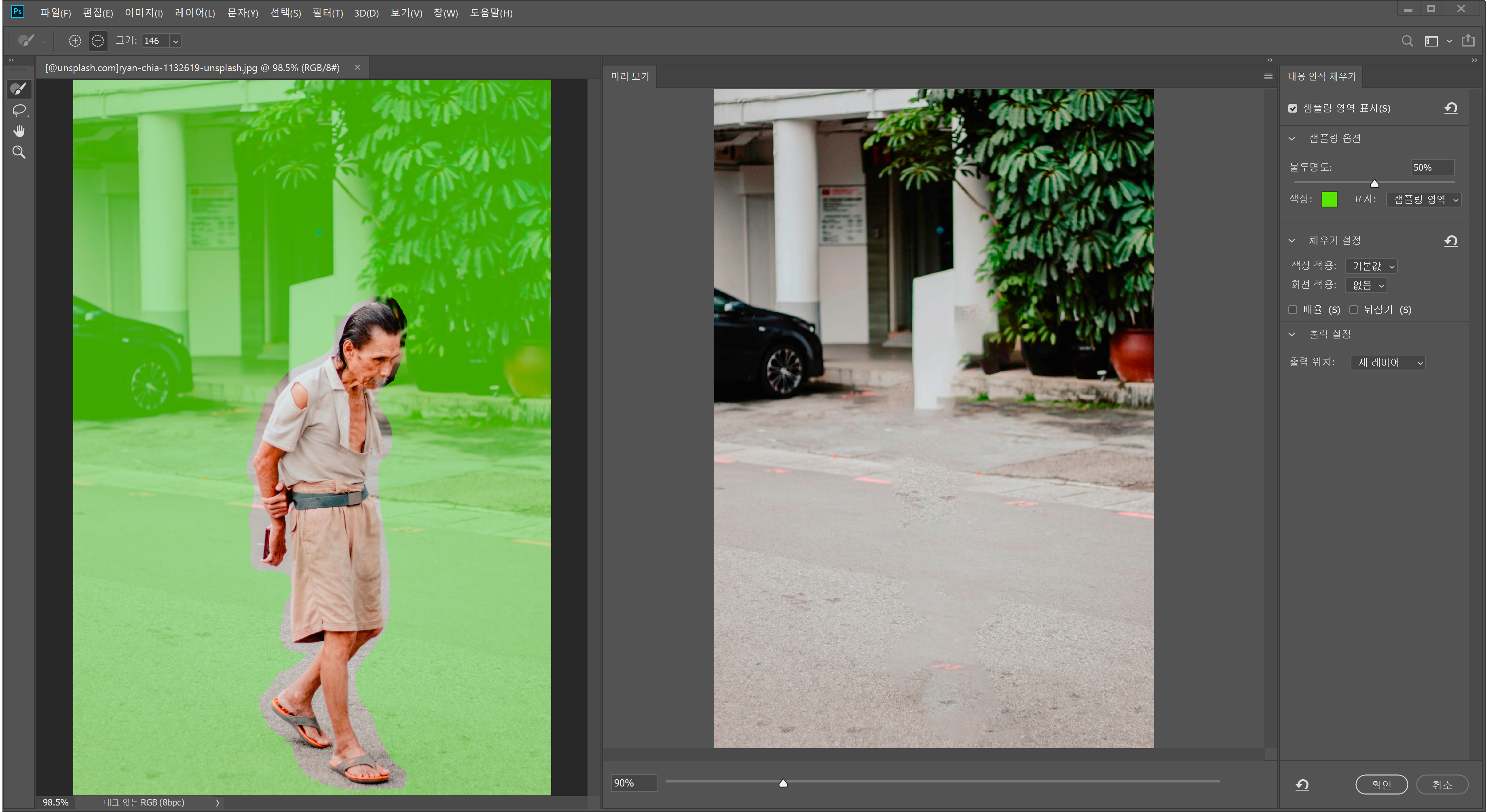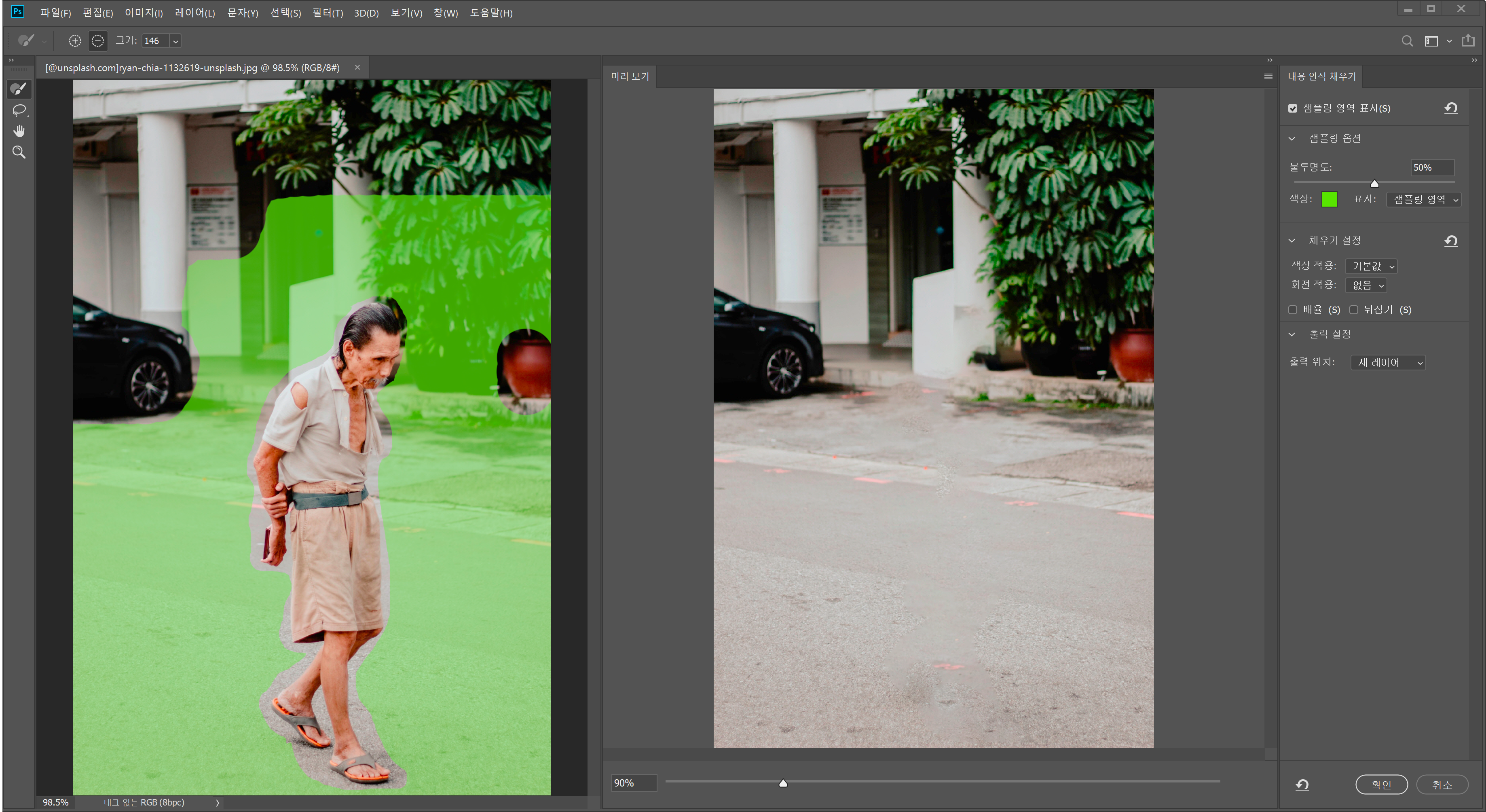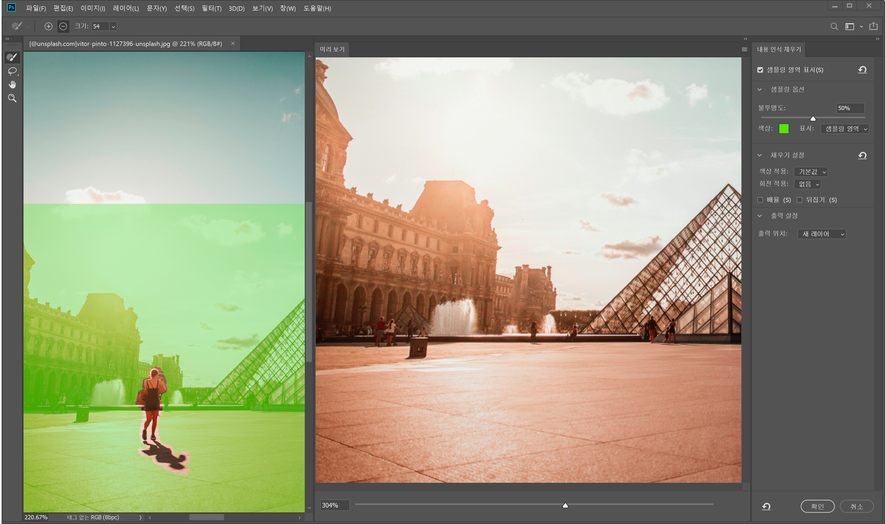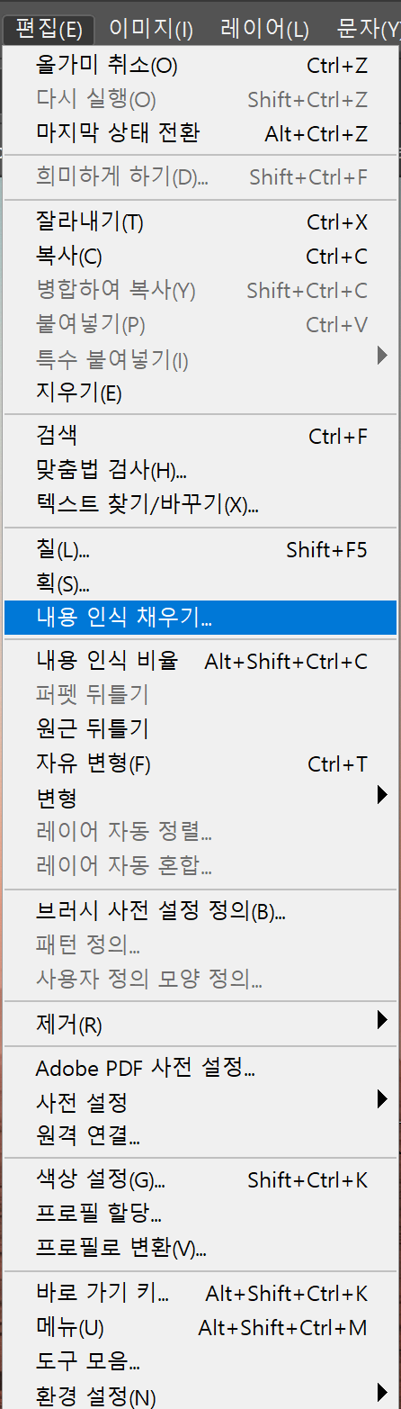편집 > 내용 인식 채우기 > 확인