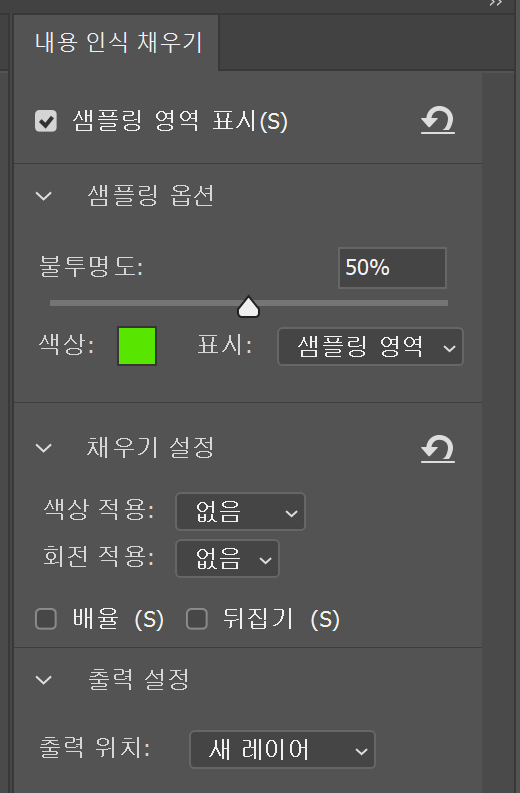 편집 > 내용 인식 채우기 > 회전 적용 > [없음/저/중/고/전체] 선택 적용