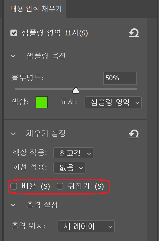 편집 > 내용 인식 채우기 > 배율 / 뒤집기 - 필요시 적용
