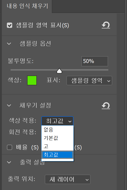 편집 > 내용 인식 채우기 > 색상 적용 > [없음/기본값/고/최고값] 선택 적용